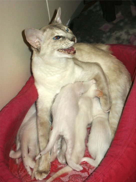 Ykköspentu Willyboy ja nelospentu Mirabello 4-viikkoisina. ![]() Vara-isukki Romeo, Heili-emo ja pesue viettävät kissanpäiviä.
